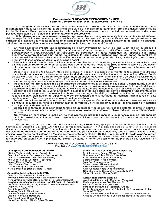 Link al texto completo de la Declaración de la Fundación Mediadores en Red sobre el Decreto 4036/18 sobre mediación en la Provincia de Santa Fé.